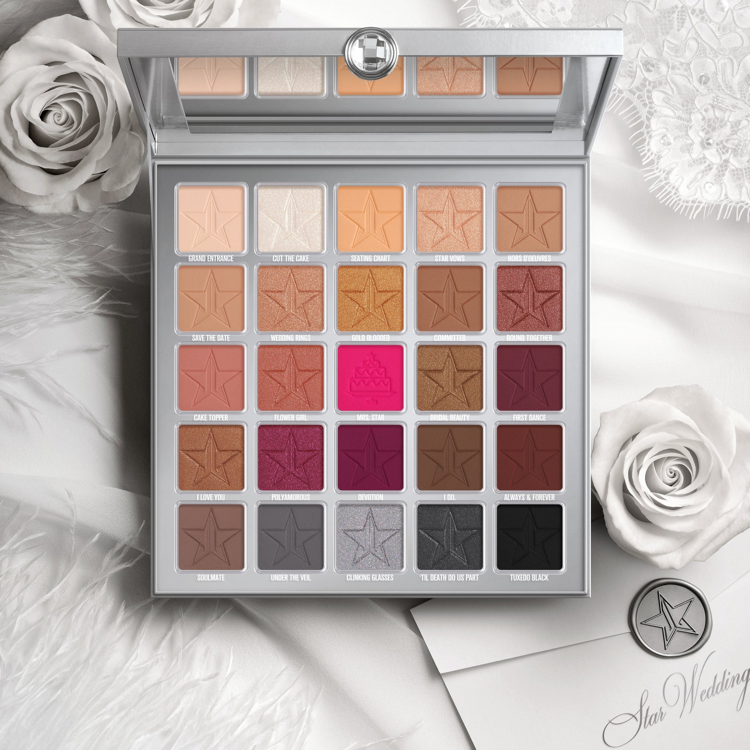 Our Star Wedding square 25-pan palette features stunning cool & warm tone nudes including our signature pop of pink to create an iconic look on your special day. This enchanting silver jewelry box-Esque palette includes our new plastic insert that beautifully encases each shade.